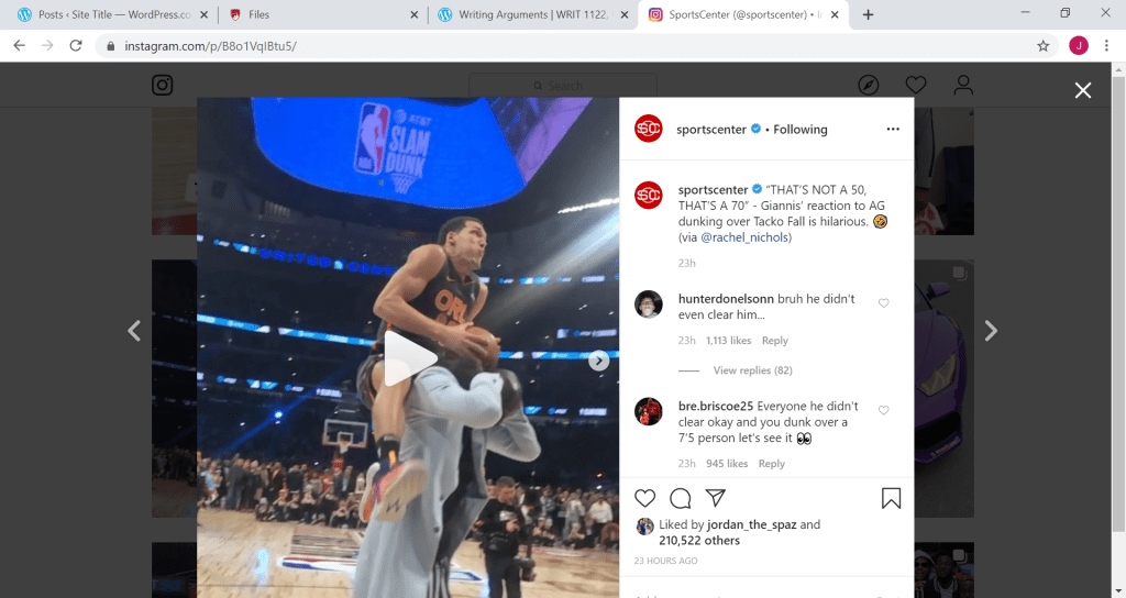 The argument of this piece is that in the 2020 NBA all star game people feel that Aaron Gordon got robbed twice from winning. The differences of this are discussed by the different posts that ESPN put out that day by showing dunks of both of the players. They kind of do in the comments but also the thing was about winning or losing so it’s kind of hard for them to find that but ESPN puts out both sides of the argument. The argument resulted in people agreeing or disagreeing.